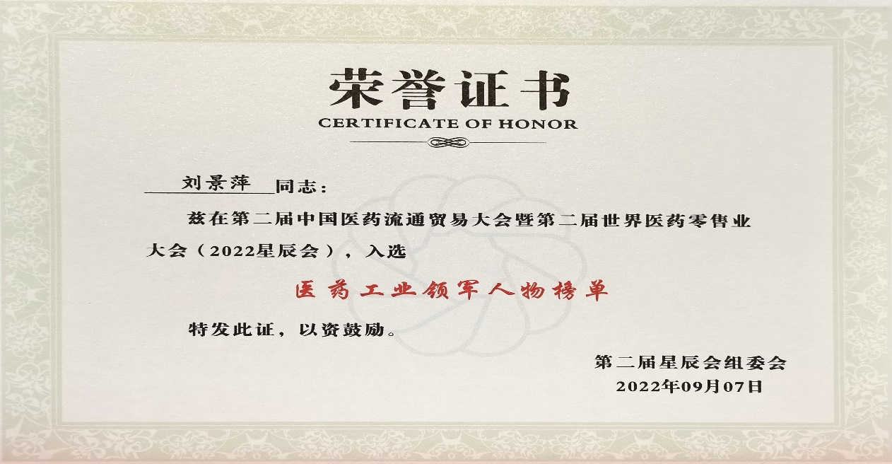 本次星辰会期间,彩虹多多斩获颇丰,获得多项行业奖项及荣誉。在开幕式上,刘景萍董事长荣获“医药工业领军人物”称号。